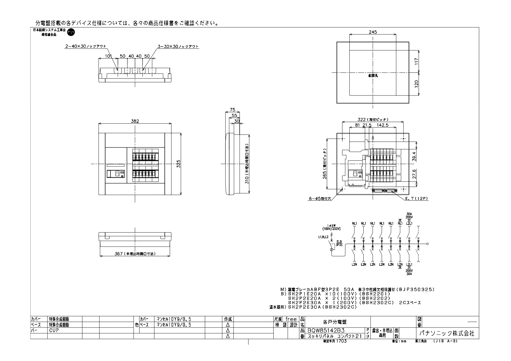 オール電化対応住宅分電盤 リミッタースペースなし エコキュート・電気温水器容量30A 露出・半埋込両用分岐送りタイプ 14+2 50A