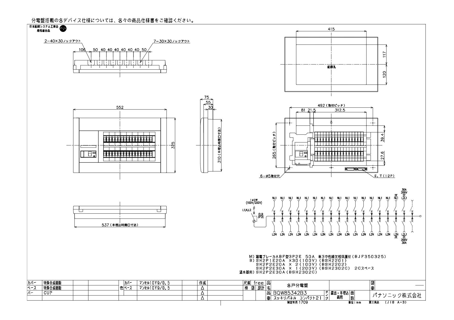 BQW85342B3 フタ無し分電盤 リミッタースペースなし 主幹ELB50A 回路数34 + 2エコキュート・電温・IH対応 エコキュート・電温容量30A