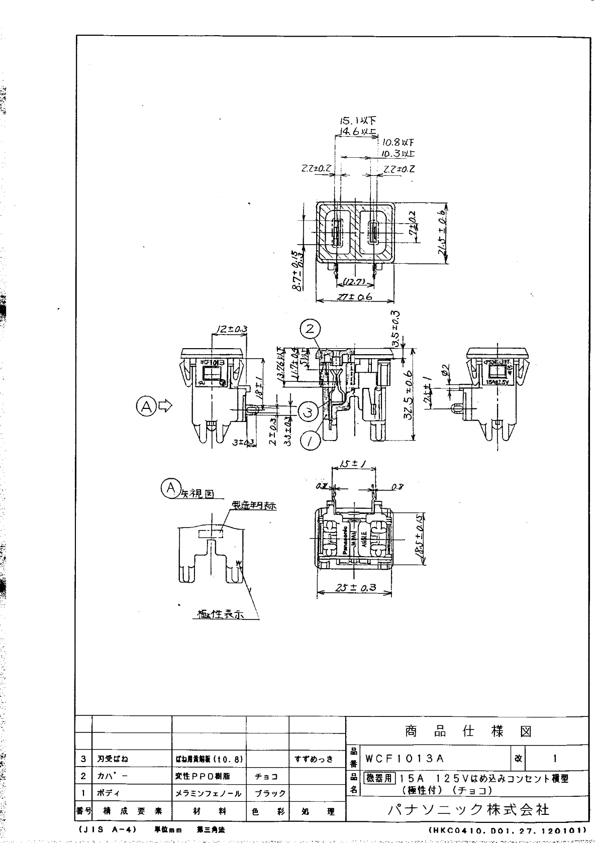品番:WCF1013A品名:[機器用]15A125Vはめ込みコンセント横型(極性付)(チョコ)