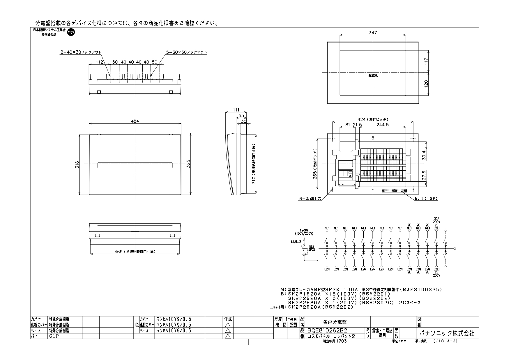 BQE810262B2 エコキュート・IH対応分電盤 単3 リミッタースペースなし 主幹ELB100A 回路数26 + 2(分岐タイプ) エコキュート容量20A