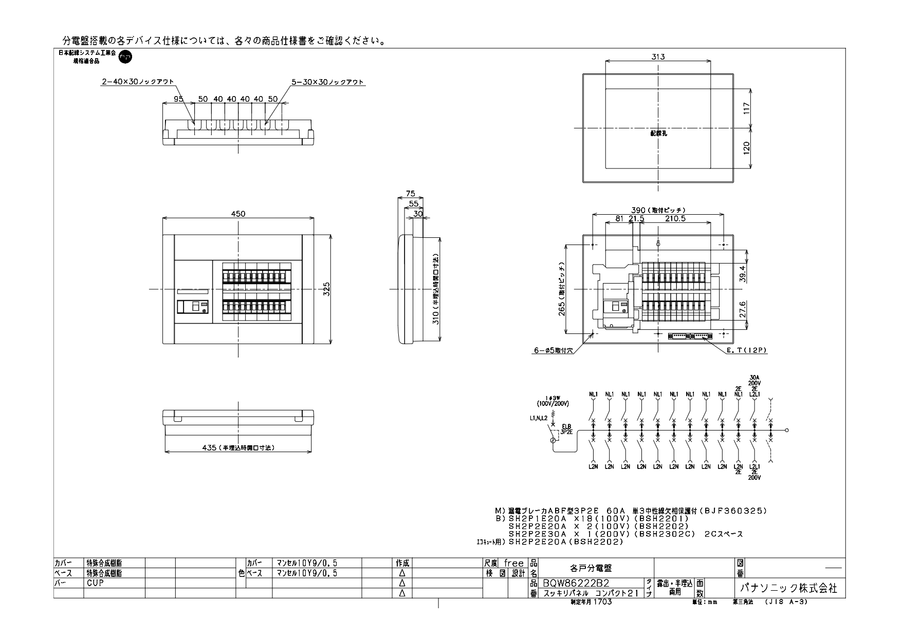 オール電化対応住宅分電盤 リミッタースペースなし エコキュート容量20A 露出・半埋込両用分岐送りタイプ 22+2 60A