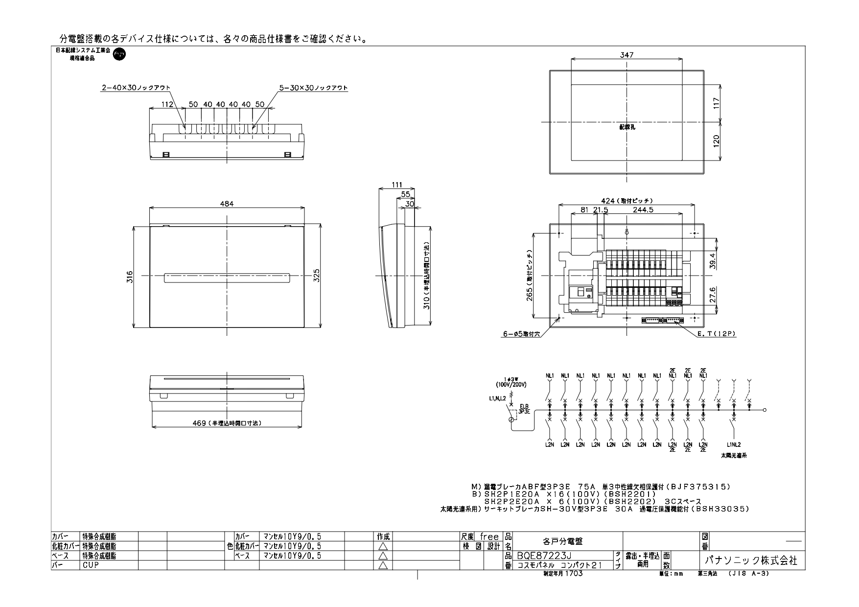 BQE87223J 太陽光発電システム対応分電盤 単3 リミッタースペースなし 主幹ELB75A 回路数22 + 3