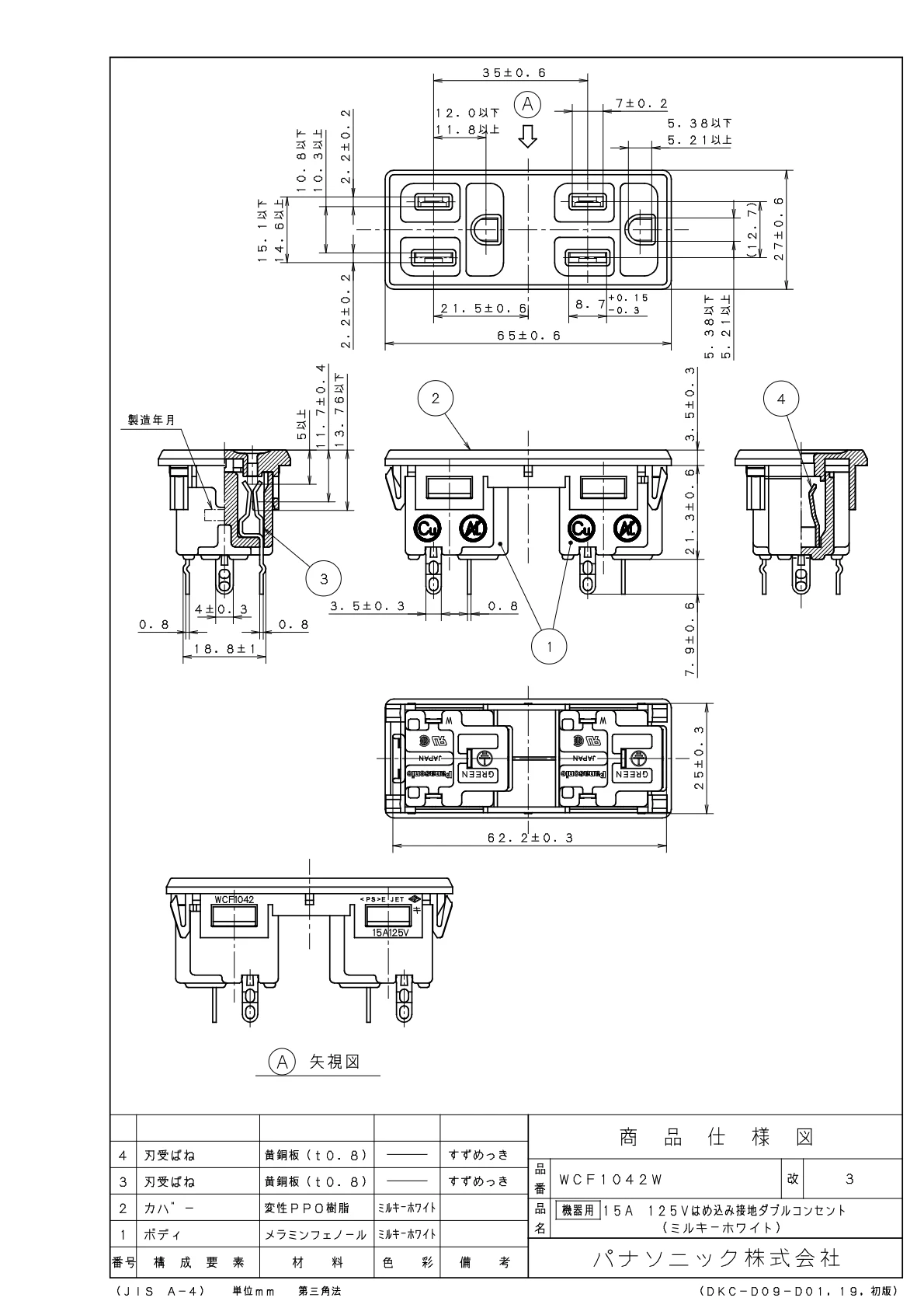 品番:WCF1042W品名:[機器用]15A125V接地はめ込みダブルコンセント(ミルキーホワイト)