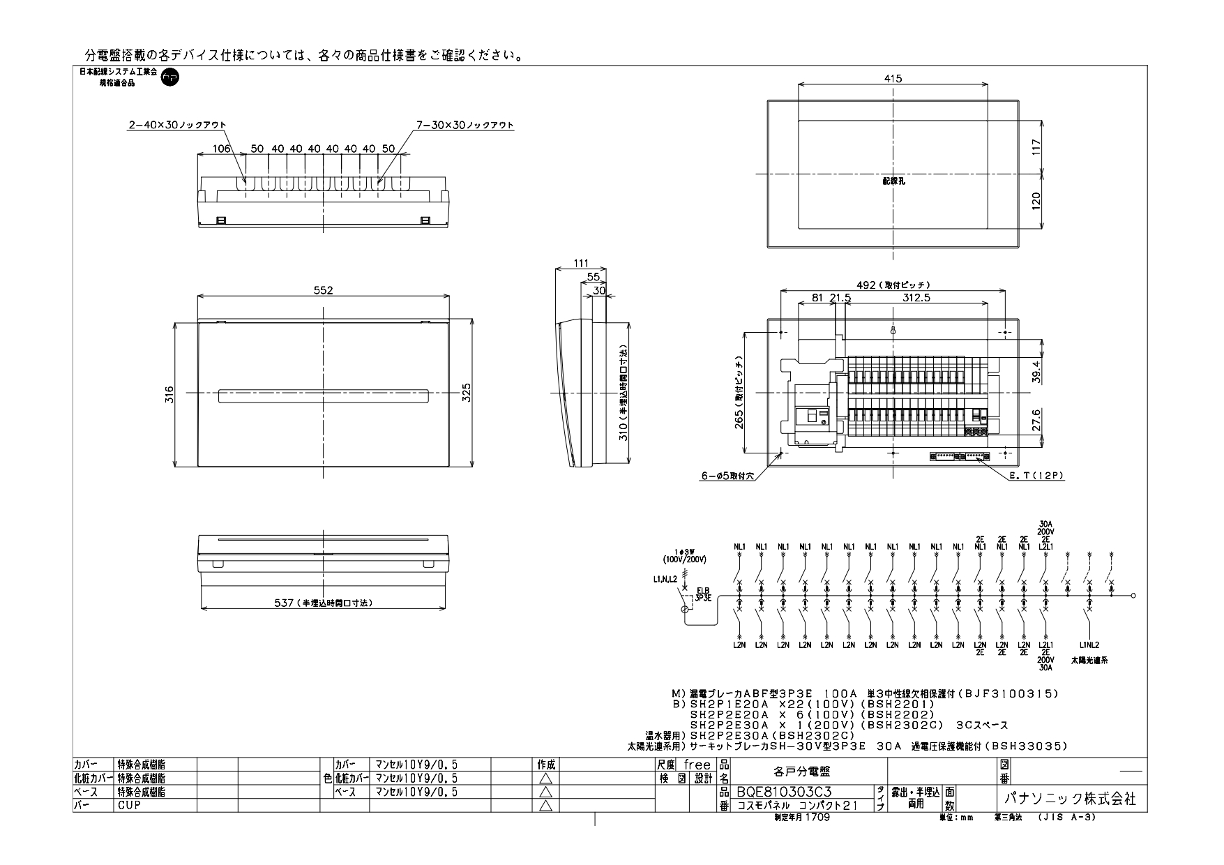 BQE810303C3 太陽光発電システム・エコキュート・IH対応分電盤 単3 リミッタースペースなし 主幹ELB100A 回路数30 + 3エコキュート容量30A