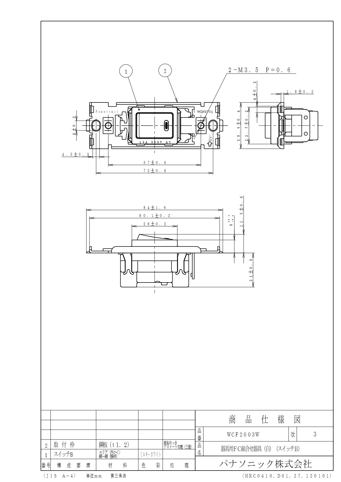 品番:WCF2003W品名:[器具用]フルカラー1PスイッチB×1(シロ)