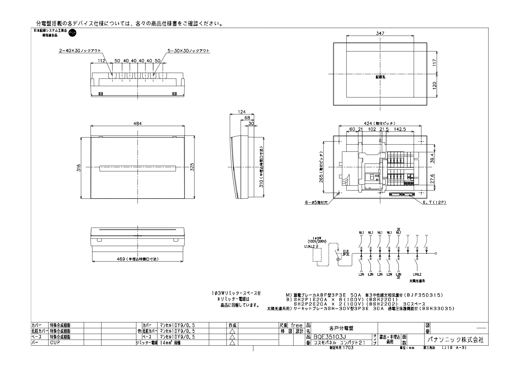 BQE35103J 太陽光発電システム対応分電盤 単3 リミッタースペースあり 主幹ELB50A 回路数10 + 3