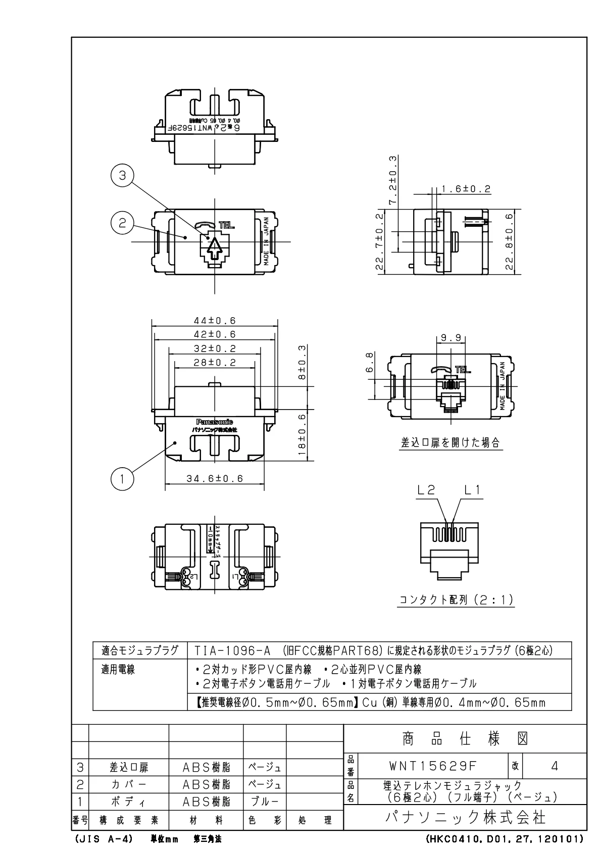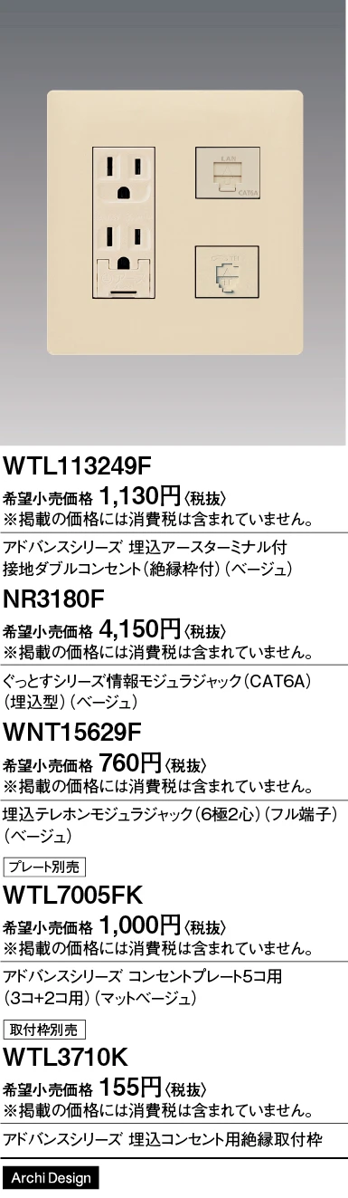品番:WNT15629F品名:埋込テレホンモジュラジャック(6極2心)(フル端子)(ベージュ)