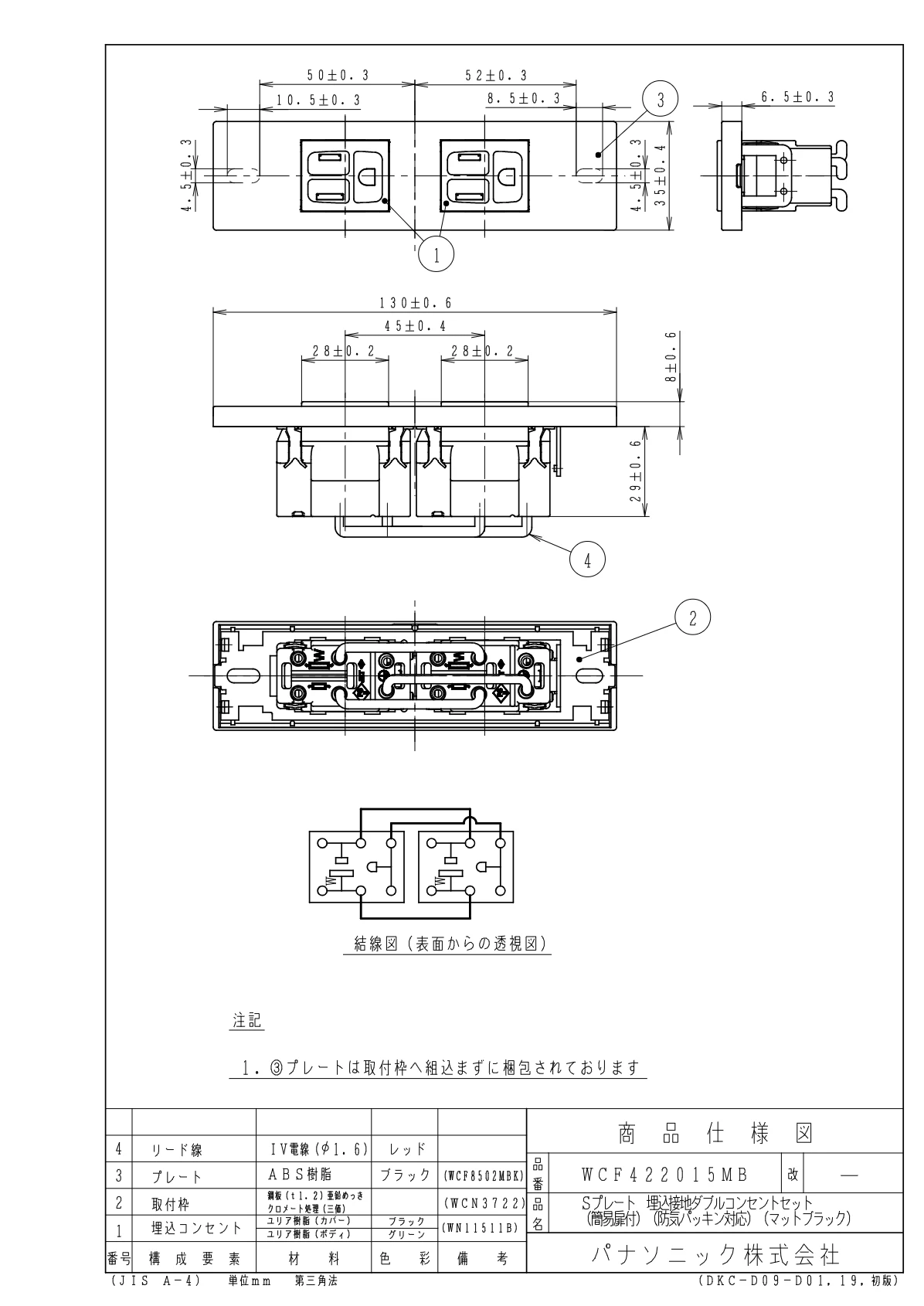 品番:WCF422015MB品名:Sプレート埋込接地ダブルコンセントセット(簡易扉付)(防気パッキン対応)(マットブラック)
