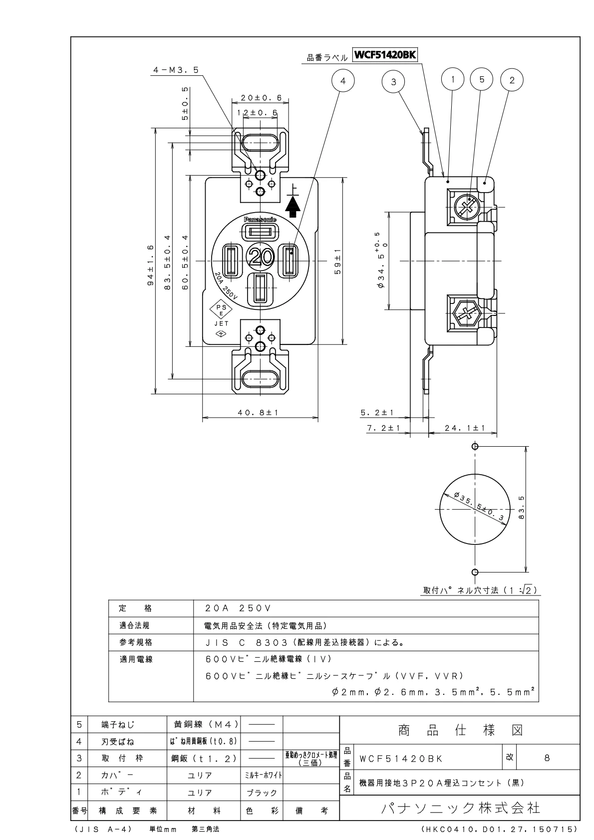 品番:WCF51420BK品名:機器用接地3P20A埋込コンセント(黒)