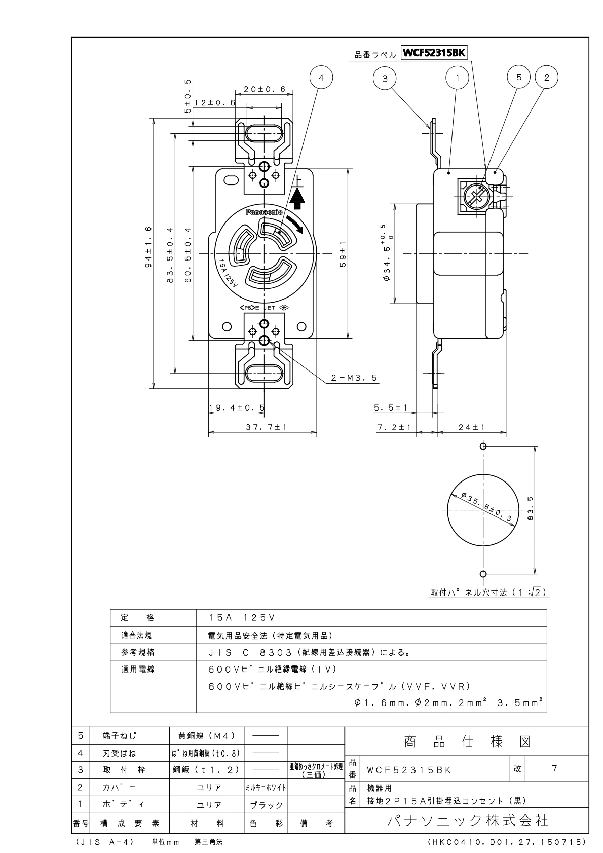 品番:WCF52315BK品名:機器用接地2P15A引掛埋込コンセント(黒)