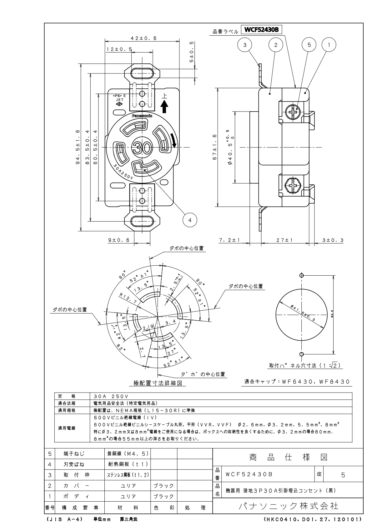 品番:WCF52430B品名:機器用接地3P30A引掛埋込コンセント(黒)