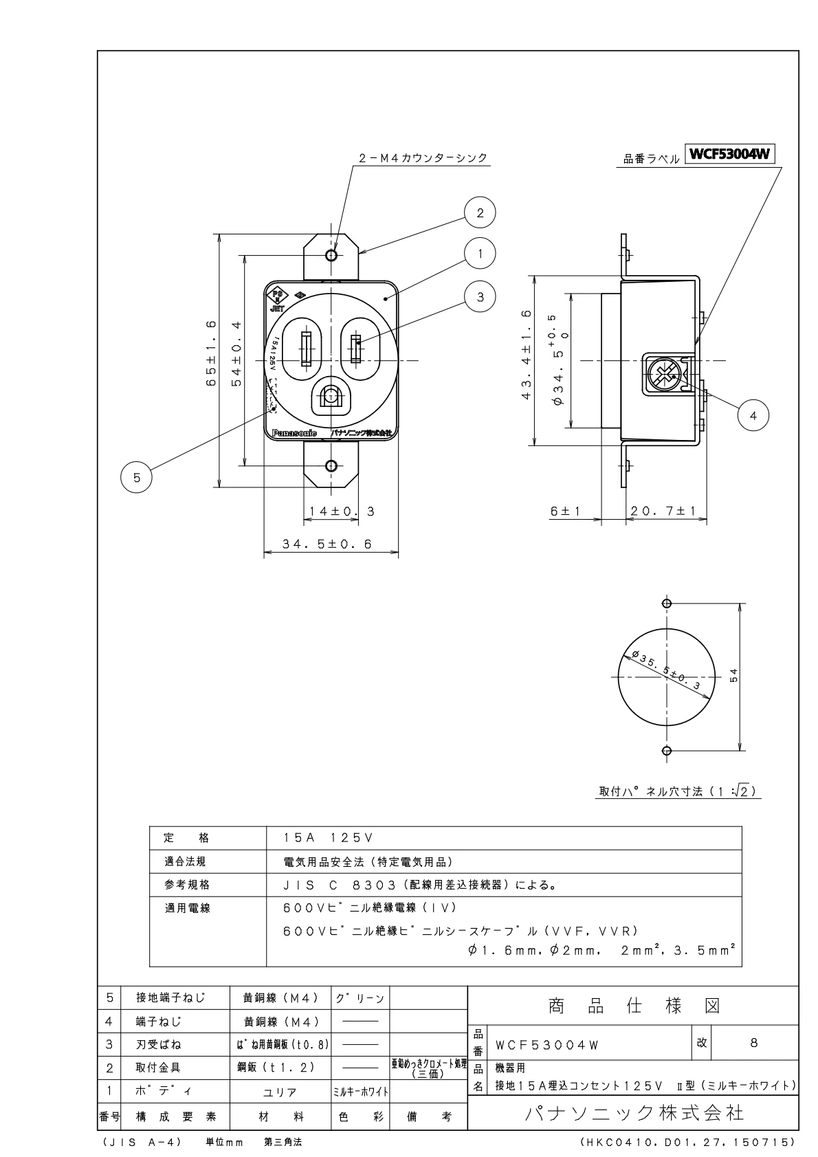 品番:WCF53004W品名:機器用接地15A埋込コンセント125VII型(ミルキーホワイト)