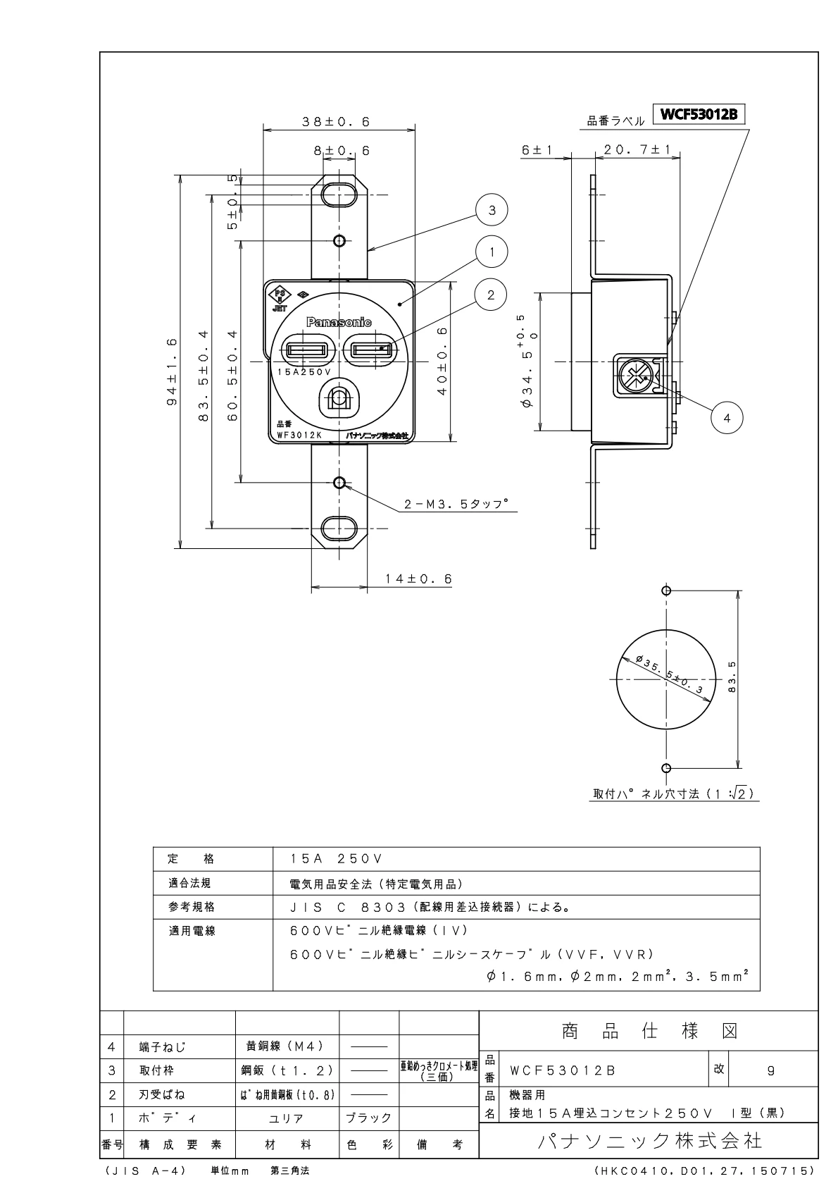 品番:WCF53012B品名:機器用接地15A埋込コンセント250VI型(黒)
