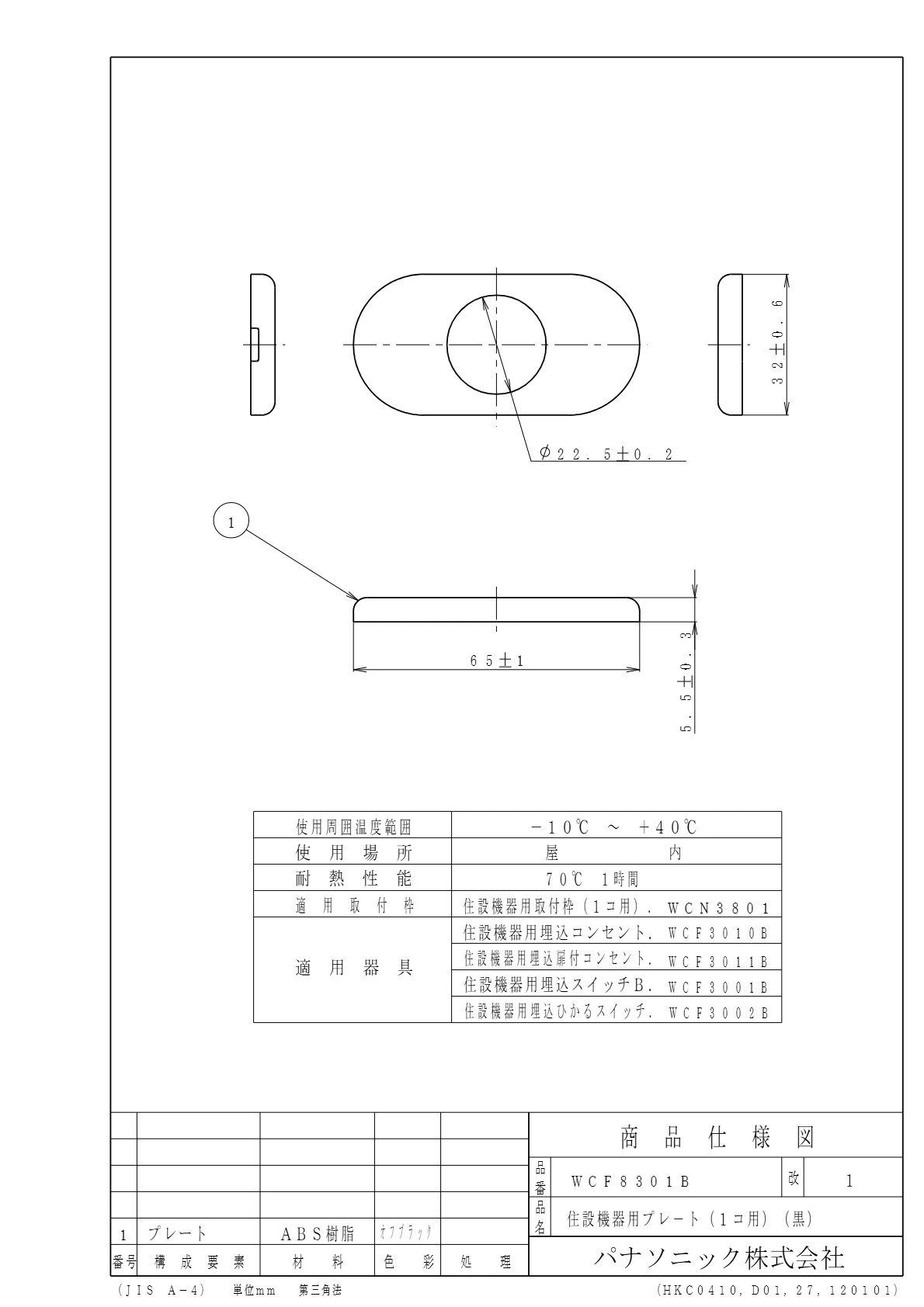 品番:WCF8301B品名:住設機器用プレート(1コ用)(黒)