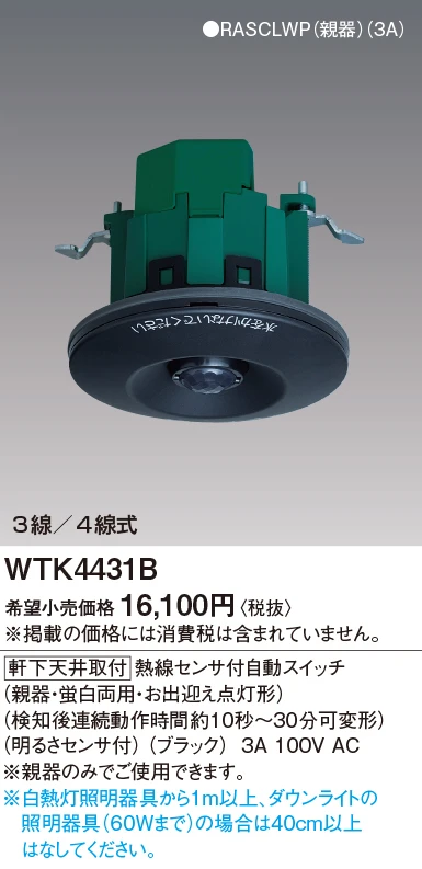 品番:WTK4431B品名:軒下天井取付熱線センサ付自動スイッチ(親器・蛍白両用・お出迎え点灯形)(検知後連続動作時間約10秒-30分可変形)(明るさセンサ付)(ブラック)