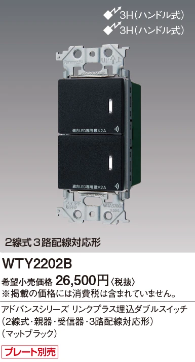品番:WTY2202B品名:アドバンスシリーズリンクプラス埋込ダブルスイッチ(2線式・親器・受信器・3路配線対応形)(マットブラック)