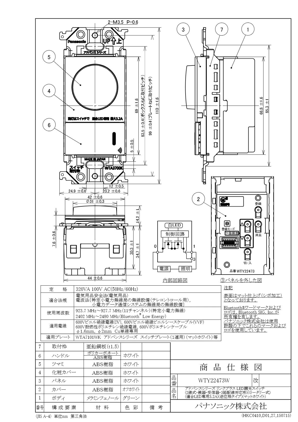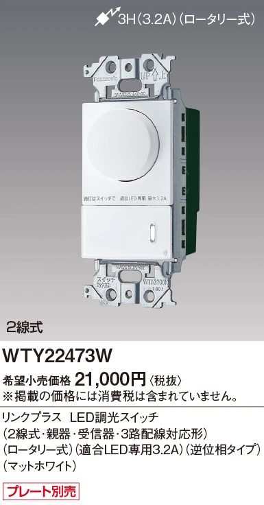 品番:WTY22473W品名:アドバンスシリーズリンクプラスLED調光スイッチ(2線式・親器・受信器・3路配線対応形)(ロータリー式)(適合LED専用3.2A)(逆位相タイプ)(マットホワイト)