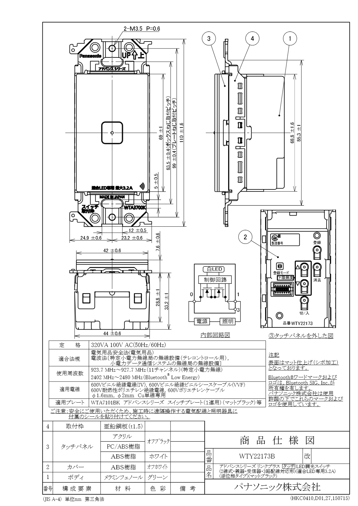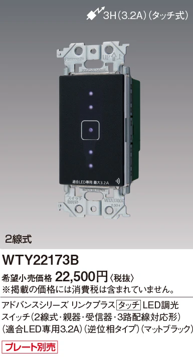 品番:WTY22173B品名:アドバンスシリーズリンクプラスタッチLED調光スイッチ(2線式・親器・受信器・3路配線対応形)(適合LED専用3.2A)(逆位相タイプ)(マットブラック)