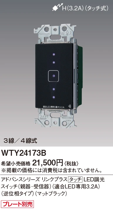 WTY24173B アドバンスリンクプラスタッチLED調光スイッチ(親器・受信器)(適合LED専用3.2A)(逆位相タイプ)(マットブラック)