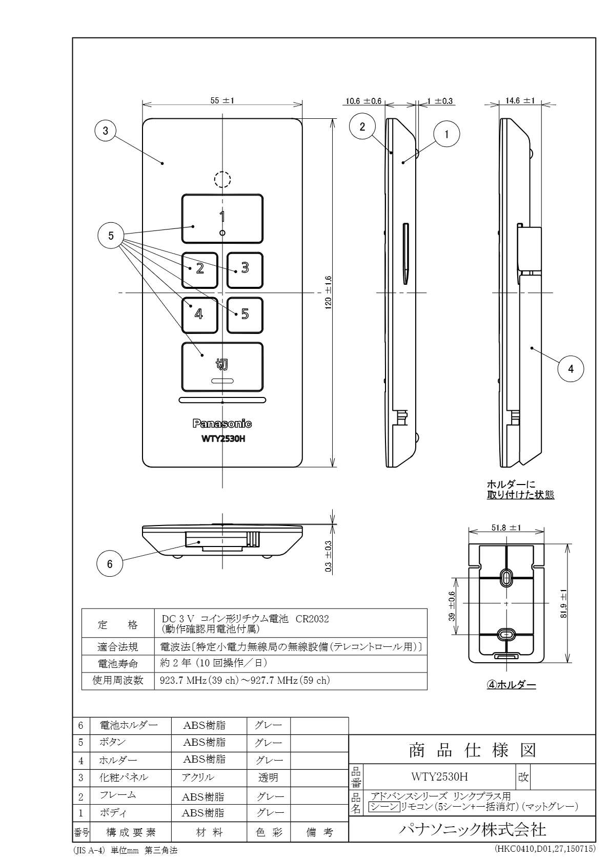 品番:WTY2530H品名:アドバンスシリーズリンクプラス用シーンリモコン(5シーン+一括消灯)(マットグレー)