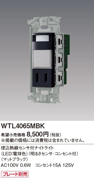品番:WTL4065MBK品名:埋込熱線センサ付ナイトライト(LED:電球色)(明るさセンサ・コンセント付)(マットブラック)