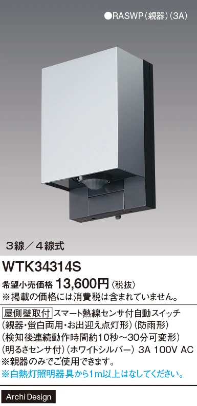 品番:WTK34314S品名:[屋側壁取付]スマート熱線センサ付自動スイッチ(親器・蛍白両用・お出迎え点灯形)(防雨形)(検知後連続動作時間約10秒-30分可変形)(明るさセンサ付)(ホワイトシルバー)