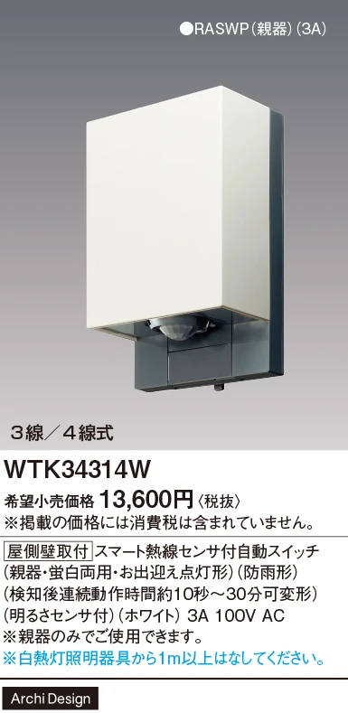 品番:WTK34314W品名:[屋側壁取付]スマート熱線センサ付自動スイッチ(親器・蛍白両用・お出迎え点灯形)(防雨形)(検知後連続動作時間約10秒-30分可変形)(明るさセンサ付)(ホワイト)