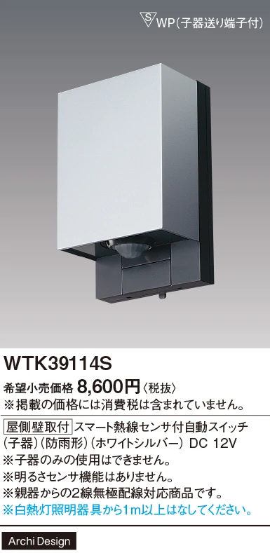 品番:WTK39114S品名:[屋側壁取付]スマート熱線センサ付自動スイッチ(子器)(防雨形)(ホワイトシルバー)
