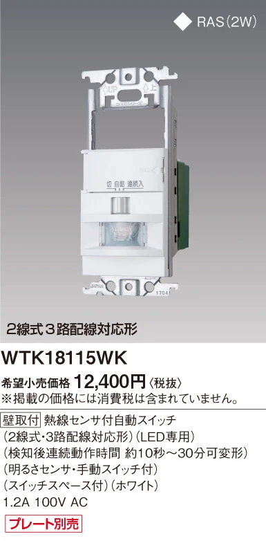 品番:WTK18115WK品名:コスモシリーズワイド21[壁取付]熱線センサ付自動スイッチ(2線式・3路配線対応形)(LED専用)(検知後連続動作時間約10秒-30分可変形)(明るさセンサ・手動スイッチ付)(スイッチスペース付)(ホワイト)