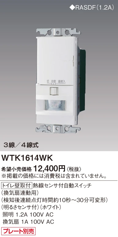 品番:WTK1614WK品名:コスモシリーズワイド21[トイレ壁取付]熱線センサ付自動スイッチ(換気扇連動用)(検知後連続点灯時間約10秒~30分可変形)(明るさセンサ付)(ホワイト)