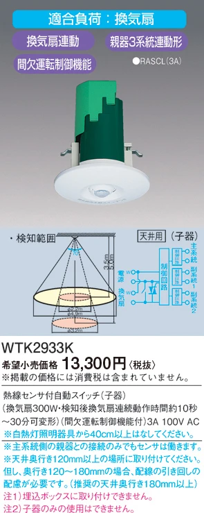 品番:WTK2933K品名:[天井取付]熱線センサ付自動スイッチ(子器・換気扇接続端子付・親器3系統連動形)(換気扇300W・検知後換気扇連続動作時間約10秒-30分可変形)(間欠運転制御機能付)(AC100V)