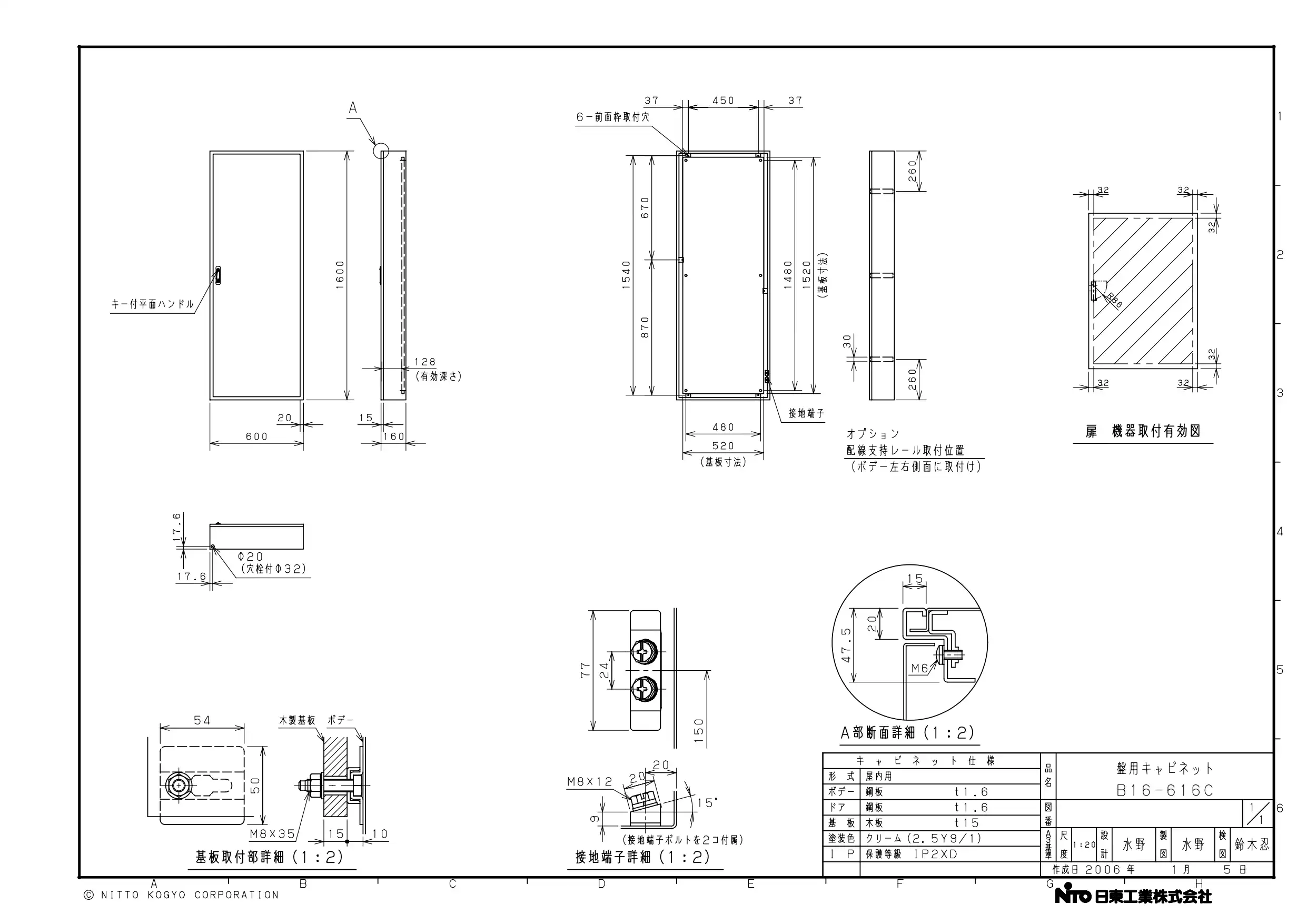 B16-616C 盤用キャビネット(露出形)(木製基板)(片扉)(外径横600×縦1600×深さ160)(基板横520×縦1520)