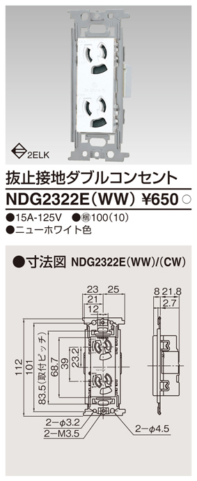 NDG2322E(WW) 抜け止め接地ダブルコンセント ニューホワイト