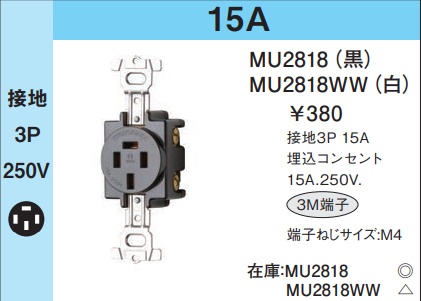 MU2818 埋込コンセント(接地3P・15A・250V)(黒)(3M端子)