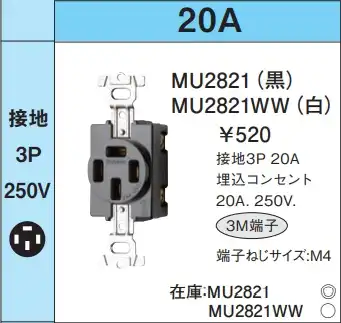 MU2821 埋込コンセント(接地3P・20A・250V)(黒)(3M端子)