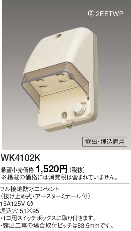 WK4102K フル接地防水コンセント(抜け止め式・アースターミナル付)(露出・埋込両用)