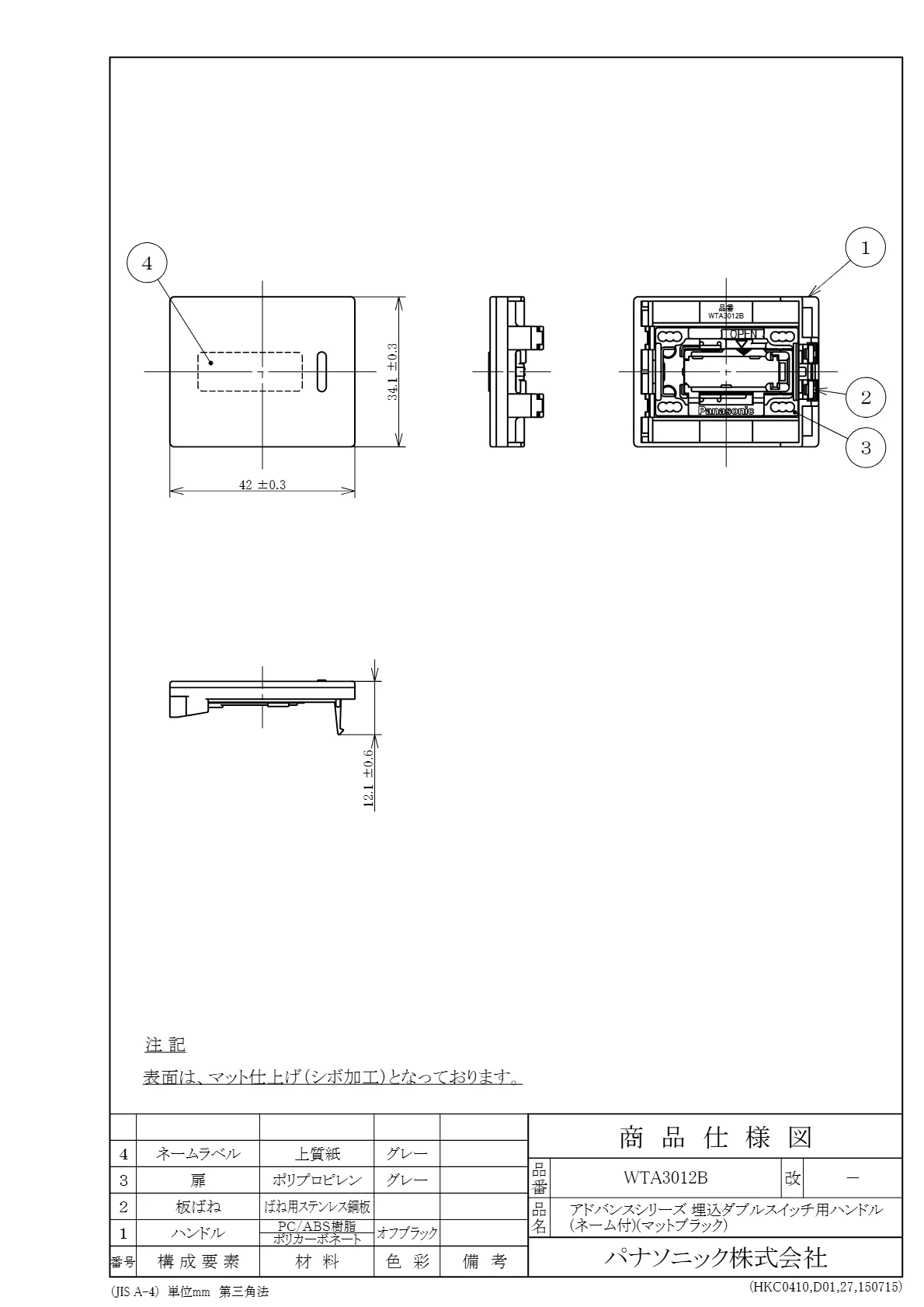 品番:WTA3012B品名:アドバンスシリーズ 埋込ダブルスイッチ用ハンドル(ネーム付)(マットブラック)
