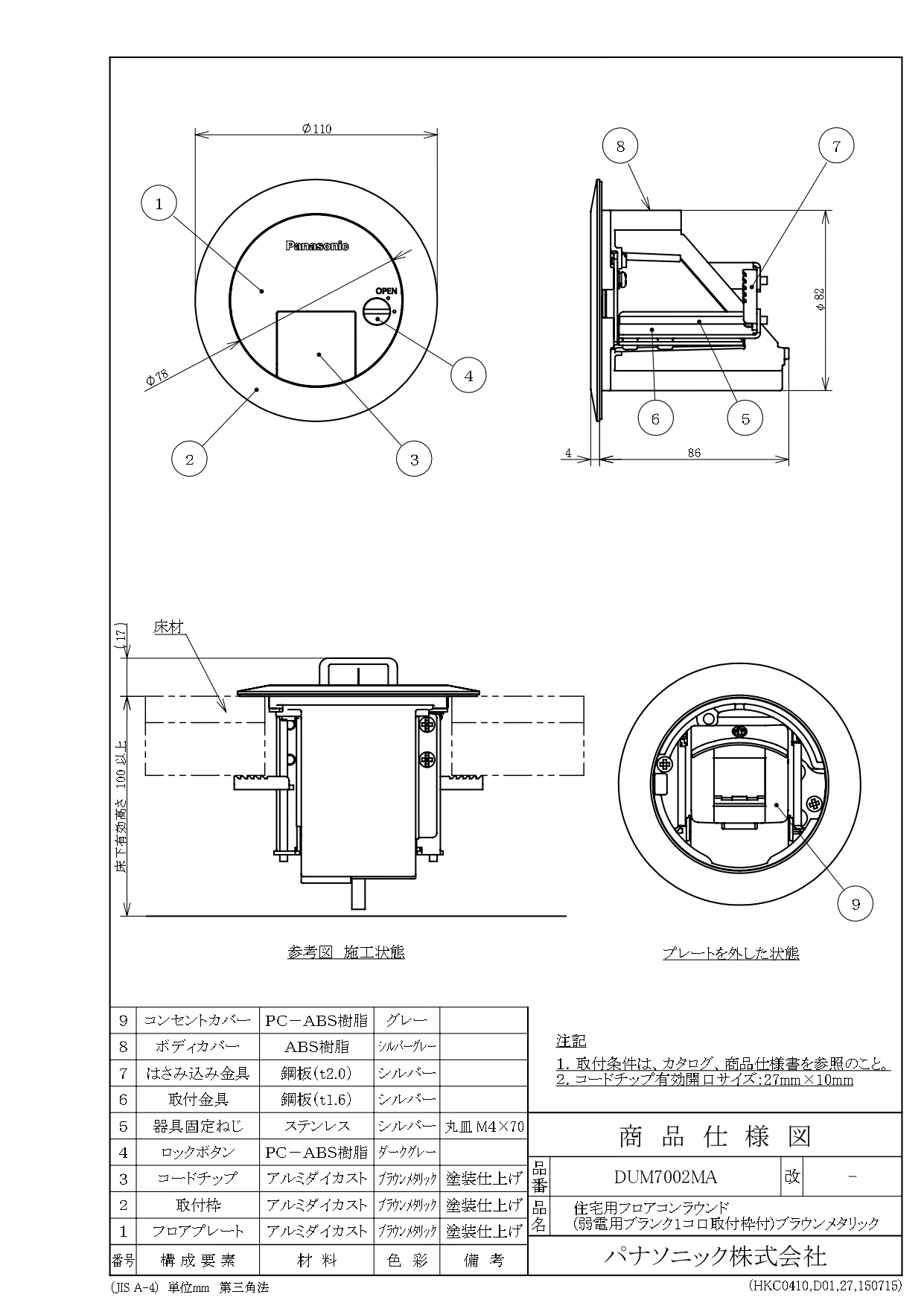 DUM7002MA 住宅用フロアコンラウンド 弱電用ブランク1コ口 取付枠付 ブラウンメタリック
