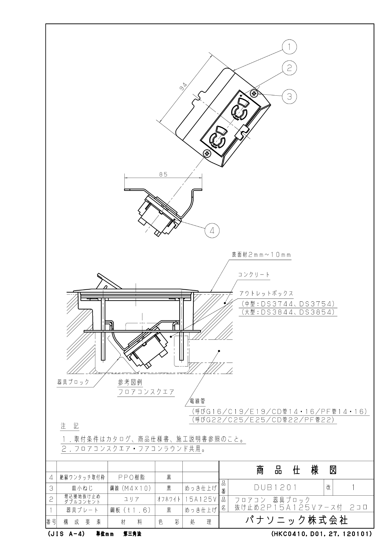 DUB1201 フロアコン器具ブロック 抜止2P15A125V E付2コ口