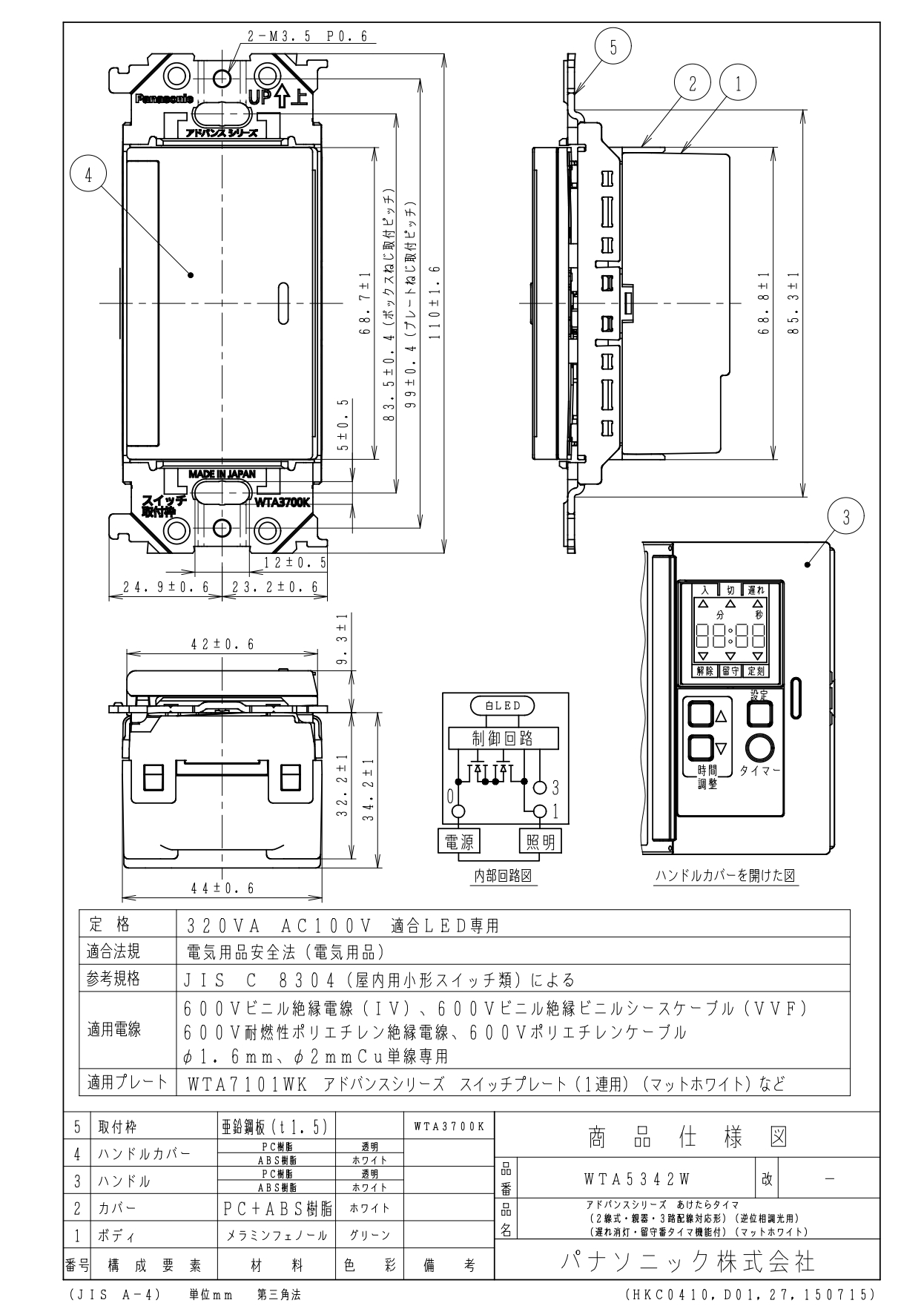 品番:WTA5342W品名:アドバンスシリーズ あけたらタイマ(2線式・親器・3路配線対応形)(逆位相調光用)(遅れ消灯・留守番タイマ機能付)(マットホワイト)