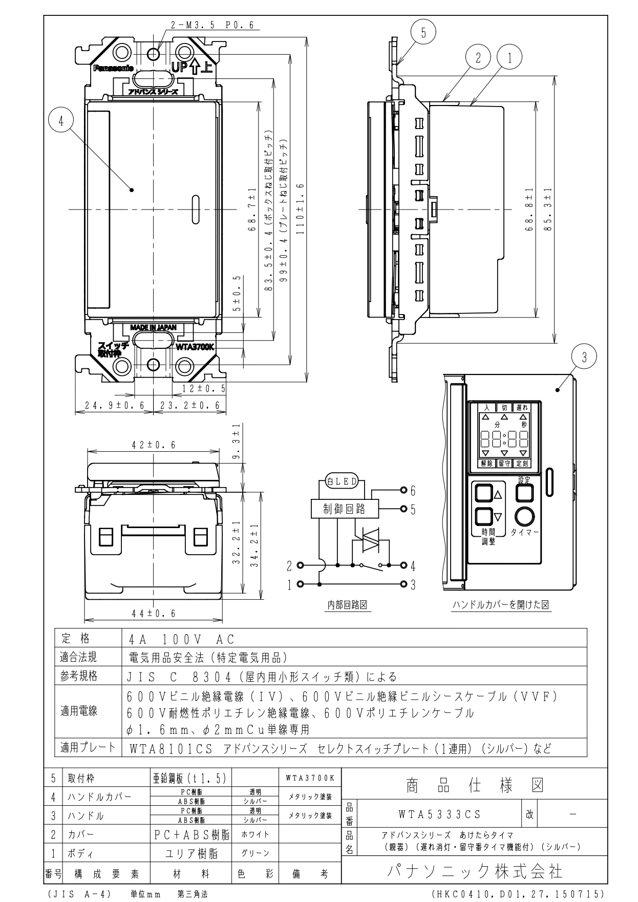 品番:WTA5333CS品名:アドバンスシリーズ あけたらタイマ(親器)(遅れ消灯・留守番タイマ機能付)(シルバー)