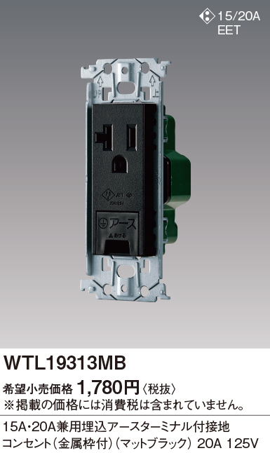 品番:WTL19313MB品名:SO-STYLE 15A・20A兼用埋込アースターミナル付接地コンセント(金属枠付)(マットブラック)