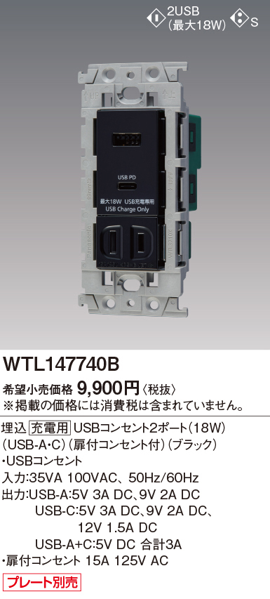品番:WTL147740B品名:埋込充電用USBコンセント2ポート(18W)(USB-A・C)(扉付コンセント付)(ブラック)