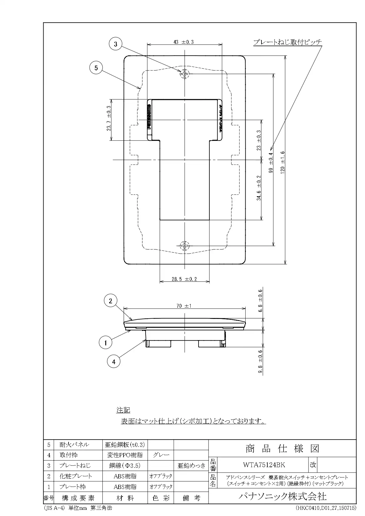 品番:WTA75124BK品名:アドバンスシリーズ 簡易耐火スイッチ+コンセントプレート(スイッチ+コンセント×2用)(絶縁枠付)(マットブラック)