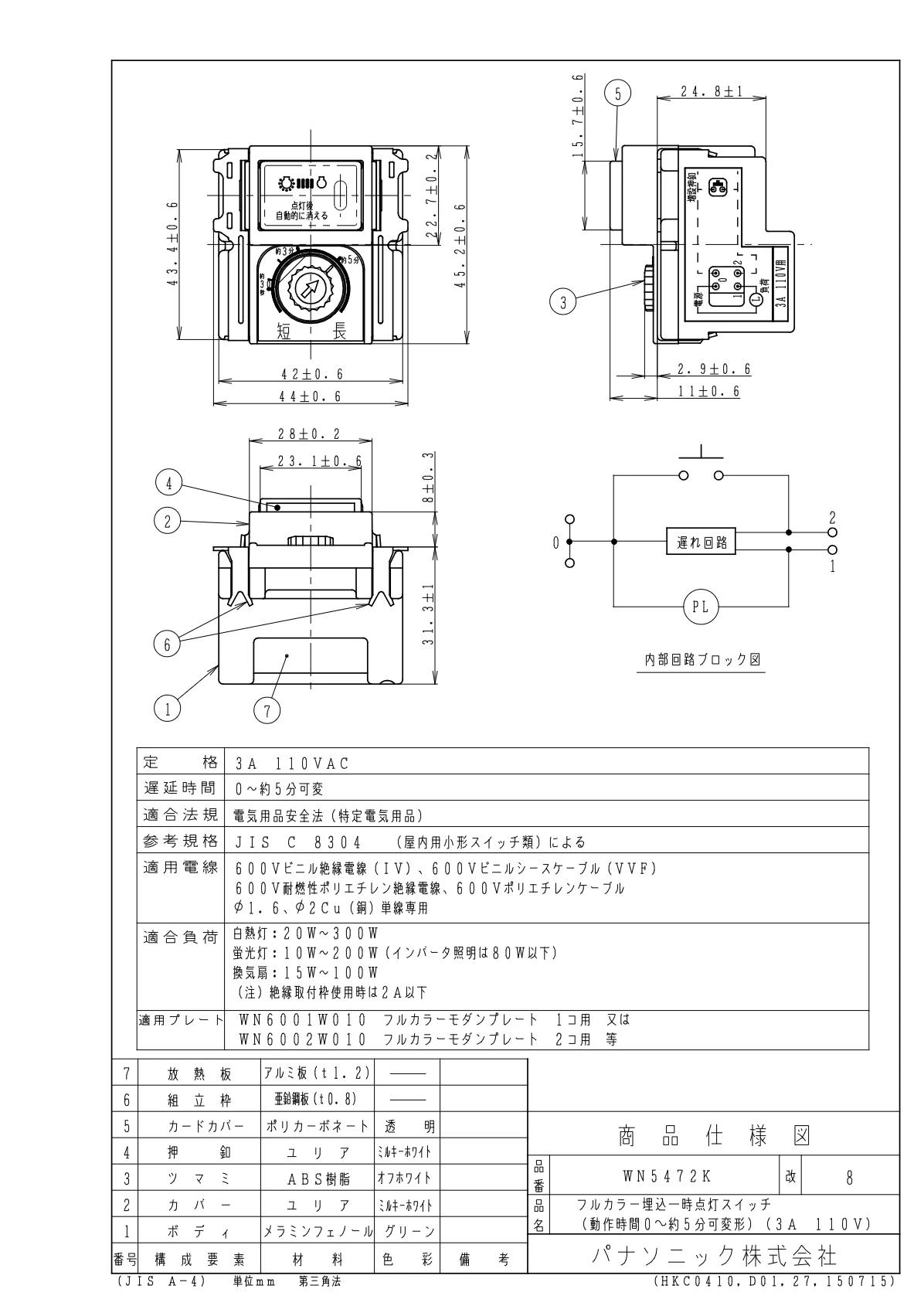 WN5472K フルカラー 埋込一時点灯スイッチ(動作時間0 - 約5分可変形)