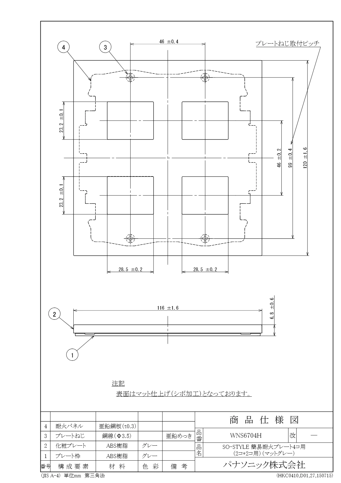 品番:WNS6704H品名:SO-STYLE簡易耐火プレート4コ用(2コ+2コ用)(マットグレー)