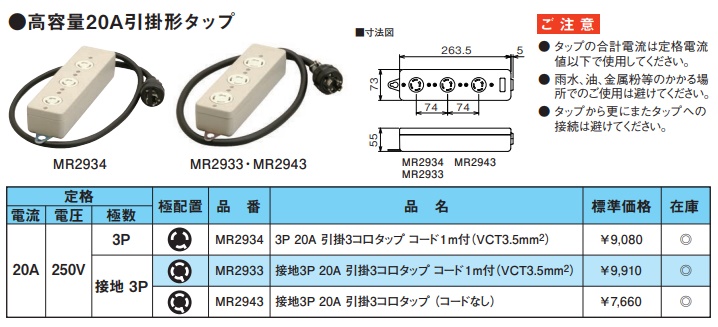 MR2934 高容量引掛形タップ(引掛3コ口)(3P・20A・250V)(VCT3.5mm2コード1m付)