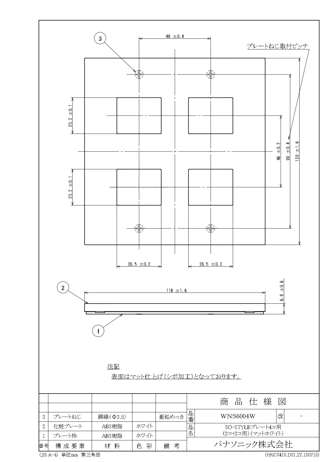 品番:WNS6004W品名:SO-STYLEプレート4コ用(2コ+2コ用)(マットホワイト)