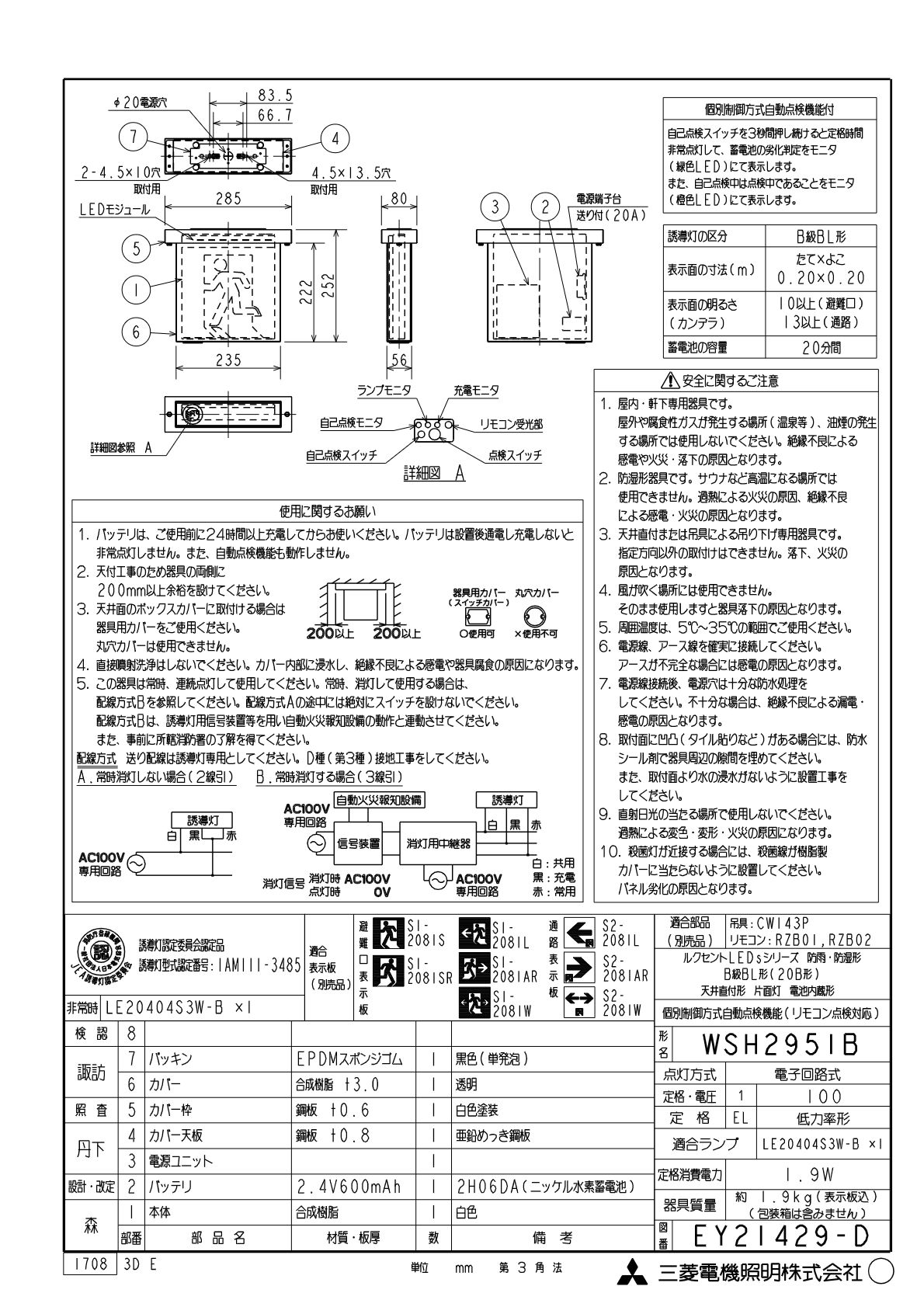 WSH2951B 1EL 【本体のみ・パネル別売】LED・防湿・防雨型誘導灯B級BL形(20B形)片面型 (天井直付・吊下兼用)