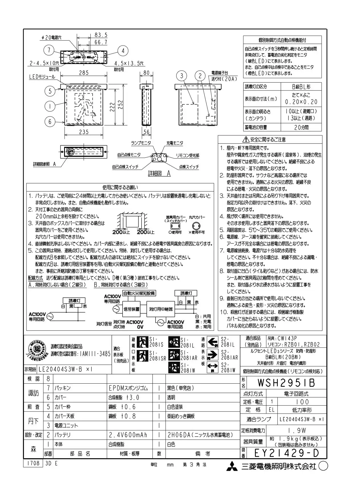 商品品番:WSH2951B1EL+S2-2081AR品名:通路・防湿・防雨型誘導灯B級BL形(20B形)片面型セット(右矢印パネル付)